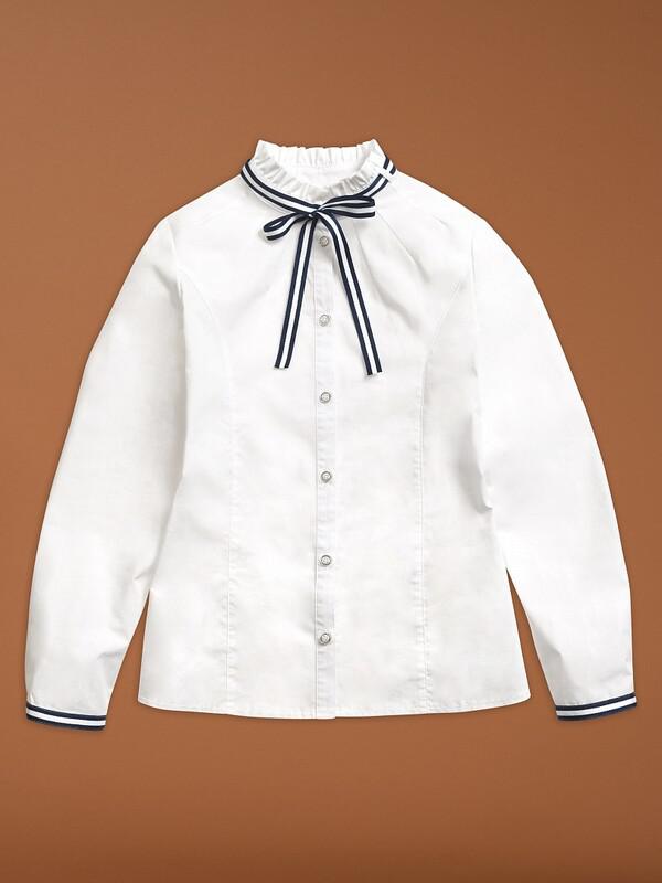 Классика, которая запомнится. Белая рубашка полуприлегающего силуэта имеет яркие акцентные вставки в виде тесьмы на манжетах и съемного декоративного банта под горловиной. Необычное прочтение воротника-стойки с аккуратно-заложенными рюшами удачно дополнено оригинальными лучами-вытачками. Актуальный образ можно сочетать с любым элементом костюма. Изделие подчеркнет характер молодой модницы и избавит мам от головной боли за школьный гардероб.