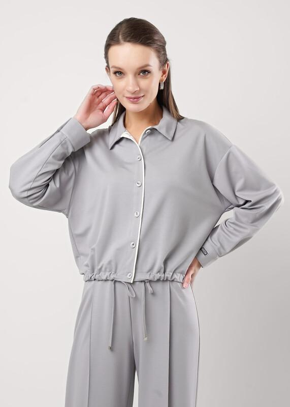 Блузка из трикотажного полотна с отложным воротником с застежкой на пуговицы.По борту планка с контрастным кантом в край.Длинный рукав со спущенной линией плеча,внизу манжета с застежкой на пуговицу,нашивка.По низу изделия кулиса со шнуром из окантовки.