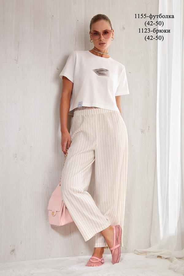Прямые, укороченные брюки из струящейся вискозы. Брюки на широком поясе, в который вставлена резинка. Функциональные карманы в боковых швах. Сзади прорезные карманы с листочками (обманки). Дополнительно в пояс вставлена декоративная деталь из французского кружева. Эти брюки отлично сочетаются с топами, укороченными джемперами и свободными рубахами и блузами, а так же прекрасно дополняют образ в сочетании со свободным жакетом в стиле Casual.