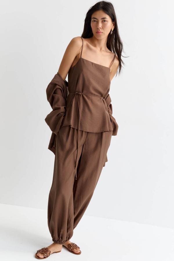 Брюки-алладины из фактурной вискозы. Модель свободного кроя. Карманы в боковых швах. Пояс и низ изделия на резинке.