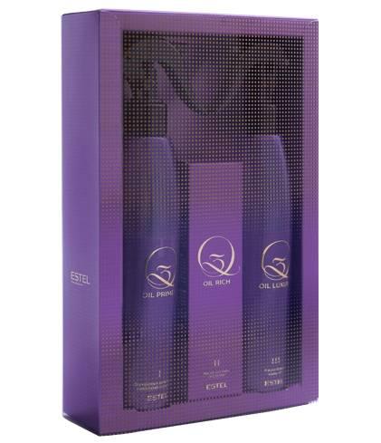В набор для процедуры входят: Двухфазный кондиционер для волос Q3 OIL PRIMER. 300мл Масло-коктейль для волос Q3 OIL RICH. 100мл Масло-блеск для волос Q3 OIL LUXURY. 300мл https://estel.pro/produkciya/servisy/q3/q3-oil-rich