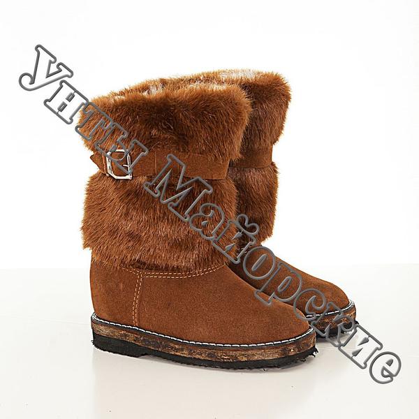 Теплые детские унты в рыжем цвете. Материал верха — мех «норка», стелька и подкладка из теплой шерсти. Детали: наружная сторона голенища выполнена из пушистого искусственного меха, внутри натуральная овчина(между ними утеплитель), войлочная подошва, логотип бренда, союзка-натуральная замша.