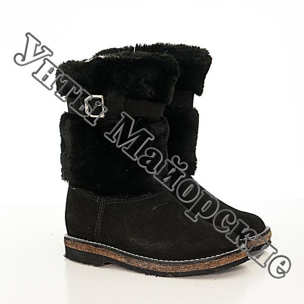 Теплые детские унты в черном цвете. Материал верха — мех «мутон», стелька и подкладка из теплой шерсти. Детали: наружная сторона голенища выполнена из пушистого искусственного меха, внутри натуральная овчина(между ними утеплитель), войлочная подошва, логотип бренда, союзка-натуральная замша.