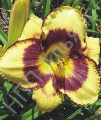 Высота 65 см, цветок кремовый с пурпурными центром и каймой