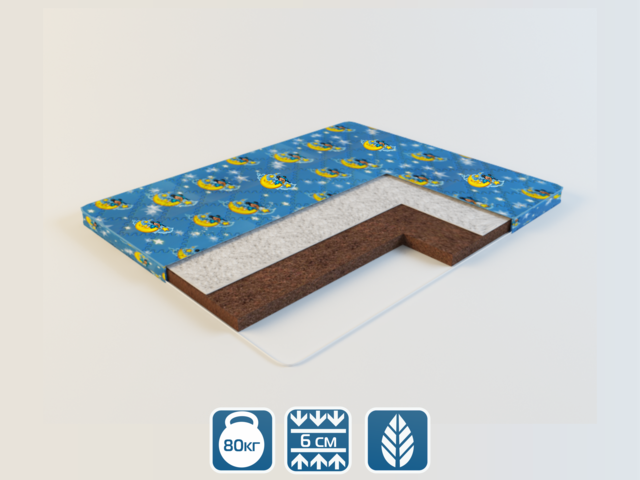 Беспружинный матрас повышенной жесткости. Двойной слой кокоса создает как прекрасную основу для позвоночника малыша, так и обеспечивает долговечность при эксплуатации. Ватин обеспечивает микроклимат во время сна.