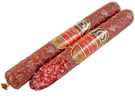 Свинина, шпик, говядина, соль йодированная, специи, коньяк, сахар, стабилизатор цвета. Срок годности 45/60 сут Вес 1 палки 1/~0.45 Оболочка Белкозин/МГС