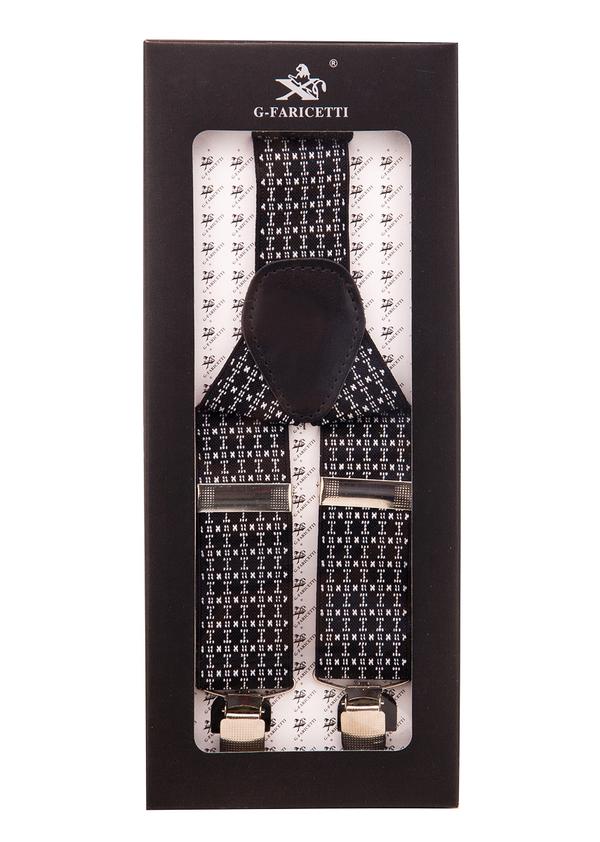 Черные подтяжки G.Faricetti с кожаной вставкой и эластичными лентами украшенными мелкими элементами. Стильные подтяжки с надежными металлическими держателями выполнены из качественных материалов поэтому прослужат вам долго. Подтяжки не только фиксируют брюки на необходимом месте но и как вертикальные линии зрительно увеличивают рост. Модные подтяжки необходимы динамичным мужчинам: они удерживают рубашку заправленную в брюки. Аксессуар благотворно воздействует на организм не нарушая циркуляцию крови в области талии. Эффектные подтяжки предлагаются в подарочной упаковке. Носите современные подтяжки G.Faricetti чтобы чувствовать себя комфортно и выглядеть великолепно!