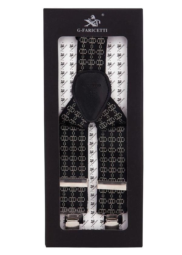 Черные подтяжки G.Faricetti с кожаным креплением в стиле ретро и эластичными лентами с серым геометрическим узором. Стильные подтяжки с надежными металлическими держателями выполнены из качественных материалов поэтому прослужат вам долго. Подтяжки не только фиксируют брюки на необходимом месте но и как вертикальные линии зрительно увеличивают рост. Модные подтяжки необходимы динамичным мужчинам: они удерживают рубашку заправленную в брюки. Аксессуар благотворно воздействует на организм не нарушая циркуляцию крови в области талии. Эффектные подтяжки предлагаются в подарочной упаковке. Носите современные подтяжки G.Faricetti чтобы чувствовать себя комфортно и выглядеть великолепно!