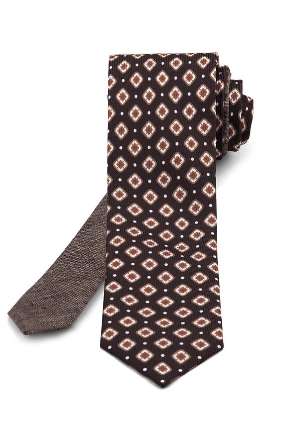 Коричневый галстук Rietti из шелка и сорочечного денима–шамбре. Комбинированный галстук ручной работы c бежевыми ромбами создан по канонами пошива люксовых галстуков. Аксессуар состоит из 3 частей выкроенных по диагонали (две детали из шелка одна - хлопок) на нижней стороне галстука расположена шлевка для продевания узкой части. Галстук Rietti будет служить долго благодаря максимальной защите шелка покрытием Teflon ®. Оригинальный галстук станет хорошим подарком для приверженцев эко-моды. Он выполнен из натуральных материалов и предлагается в перерабатываемой крафт-упаковке. Неформальный галстук Rietti в сочетании с пиджаком и джинсами подчеркнет хорошее воспитание чувство стиля и добавит немного иронии в повседневный костюм.