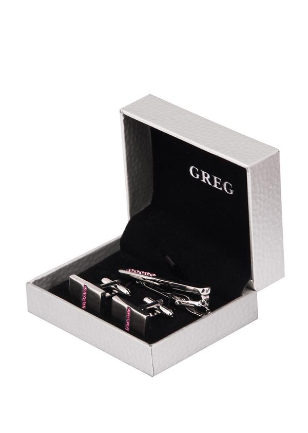 Подарочный набор GREG состоит из зажима для галстука и запонок с розовыми стразами. Аксессуары выполнены из латуни с прочным гальваническим покрытием под серебро. Удобное крепление запонки типа пушка обеспечивает надежную фиксацию на манжете. Прекрасно дополняют сорочки с двойными французскими или универсальными манжетами (под запонки и пуговицы). Подвижный фиксатор и цепочка для пуговицы обеспечивают надежное крепление зажима. Универсальная длина зажима подходит для всех видов галстуков. Лаконичные украшения подчеркнут изысканный вкус знатоков классического стиля. Аксессуары GREG - эффектный подарок для современных мужчин.