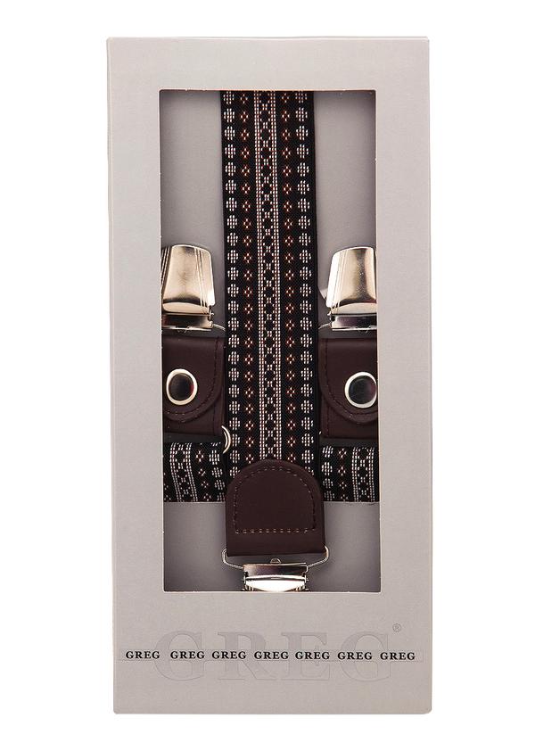 Черные подтяжки GREG с кожаными вставками и орнаментальными эластичными лентами. Стильные подтяжки с надежными металлическими держателями выполнены из качественных материалов поэтому прослужат вам долго. Подтяжки не только фиксируют брюки на необходимом месте но и как вертикальные линии зрительно увеличивают рост. Модные подтяжки необходимы динамичным мужчинам: они удерживают рубашку заправленную в брюки. Аксессуар благотворно воздействует на организм не нарушая циркуляцию крови в области талии. Эффектные подтяжки GREG предлагаются в подарочной упаковке. Носите современные подтяжки чтобы чувствовать себя комфортно и выглядеть великолепно!
