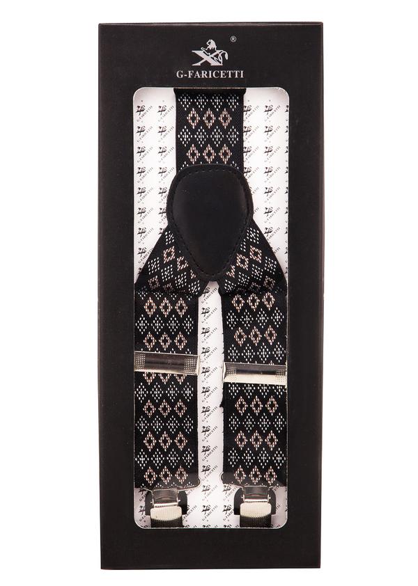 Черные подтяжки G.Faricetti с кожаной вставкой и эластичными лентами с бежевыми ромбами. Стильные подтяжки с надежными металлическими держателями выполнены из качественных материалов поэтому прослужат вам долго. Подтяжки не только фиксируют брюки на необходимом месте но и как вертикальные линии зрительно увеличивают рост. Модные подтяжки необходимы динамичным мужчинам: они удерживают рубашку заправленную в брюки. Аксессуар благотворно воздействует на организм не нарушая циркуляцию крови в области талии. Эффектные подтяжки предлагаются в подарочной упаковке. Носите современные подтяжки G.Faricetti чтобы чувствовать себя комфортно и выглядеть великолепно!