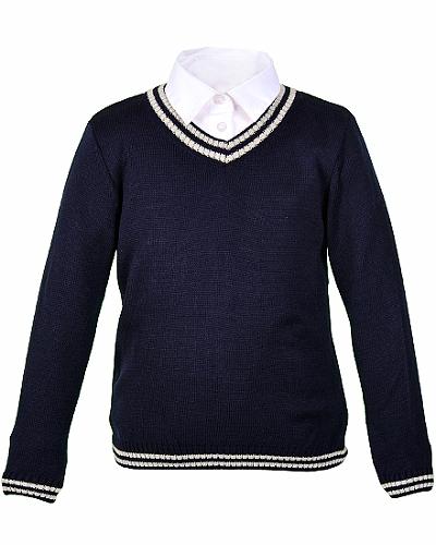 Джемпер Crockid Полоска для мальчика темно-синий - стильная вязаная модель с контрастными белыми полосками, идущими по краю V-образной горловины, низу изделия и манжетам рукавов. Подходит для повседневного ношения в школе.