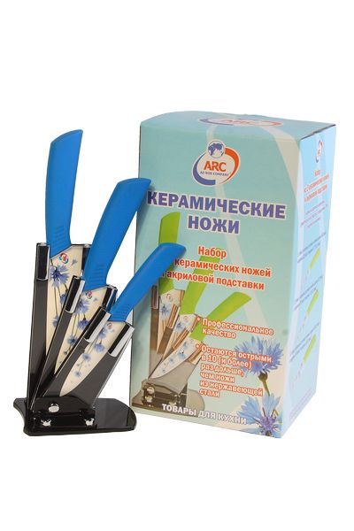 Набор керамических ножей с цветным рисунком на пластиковой подставке. Размеры ножей - 4; 5 и 6 дюймов. Размеры лезвия ножей (длина/ширина/толщина): 4 дюйма - 102/22/1,75-1,8мм., 5 дюймов - 127/25/1,8-1,9мм., 6 дюймов - 152,5/34/1,9-2мм. Керамические ножи ARC (как и подавляющее большинство керамических ножей других фирм) производятся на заводах Китая. Мы полностью контролируем процесс изготовления ножей, строго соблюдая технологию производства. Благодаря собственному производству, мы имеем возможность предложить Вам безупречное качество по доступным ценам! Тысячи наших клиентов уже убедились в том,что керамические ножи - это удобно, практично, качественно! Мы заботимся о Вашем здоровье!