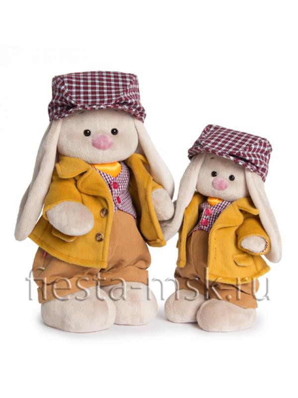 Зайка Ми Лондон (мальчик) из коллекции Британские Каникулы одет как настоящий джентельмен: добротное шерстяное пальто горчичного цвета, классические вельветовые брючки цвета "кэмел", жилет в мелкую бордовую клеточку "виши" и шейный рыжий платок из шелковистого сатина. Завершает образ модная клетчатая кепка.