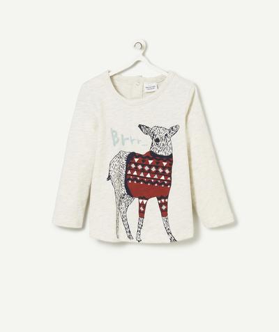 We love this T-shirt with its lovely flocking! Your little boy won't want to take it off! T-SIHRT INDE, round neck, long sleeves, poppers, velvet flocking, print.