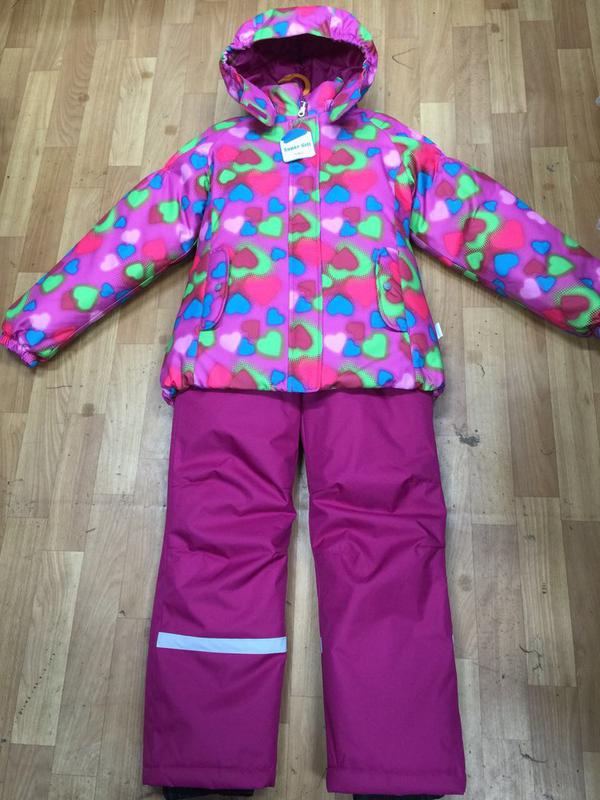 Штаны на лямках, снегозащитная юбка снизу. На рукавах резиночки. Капюшон на кнопках отстегивается. Светоотражающие элементы.
