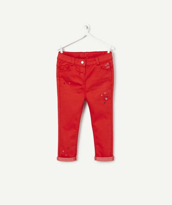 Colourful and comfortable, it's time to adopt this trendy slim fit. These slim red trousers sprinkled with hearts will brighten up your little girl's look. We love the heart patch inside the pocket and the trendy turn-ups. With their adjustable waist and popper fastening these trousers will ensure that your little girl is comfortable in her outfit. Style tip: team it with a long-sleeved t-shirt in a bright colour.