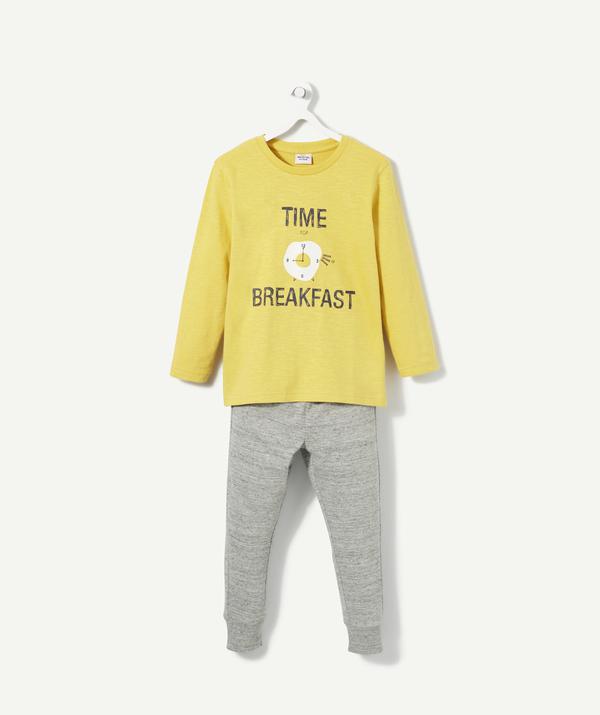 Don't forget! This product is at the same price for all ages from 2 to 14. These yellow and grey marl pyjamas are lovely! We love them! PYJAMAS, round neck, long sleeves on t-shirt, elasticated waistband on trousers with drawstring, printed.