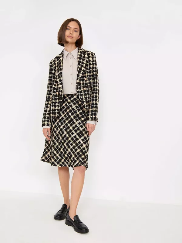 https://www.emkafashion.ru/catalog/sale/s988_denal/// Фактурная юбка в клетку. Выполнена из материала с содержанием вискозы, на подкладке. Модель А-силуэта имеет оптимальную длину по колено и высокую посадку. Застёгивается на молнию сбоку. Юбку можно надеть с жакетом из комплекта, яркой водолазкой или базовой рубашкой.// Размерный ряд: 40-56