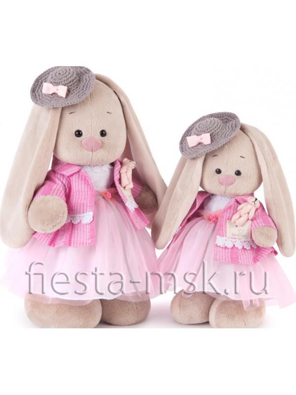 Зайка Ми Розовый одета в нарядное белое платьице с пышной нежно-розовой юбкой. Юбочку украшает небольшое украшение с розочкой. Поверх платья у зайки надет розовый жакет с украшением из кружева, а на его воротничке - брошкав виде мишки. На ушке у зайки вязанная шляпка с милым бантиком.