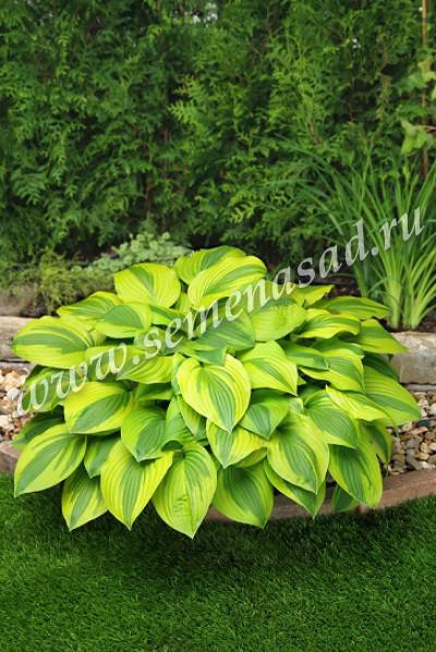 яркая, эффектная хоста. Крупные темно-зеленые листья, я срко выраженным жилкованием и очень широкой золотистой каймой, цветки бледно-лавандовые Кол-во в упак., шт.: 1 Разбор: I Высота,см: