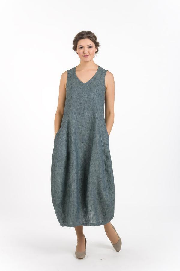 Платье женское прилегающего силуэта, с увеличенным объемом по бедрам и зауженное к низу, без рукавов. По переду углубленный вырез горловины, рельефы и клинья. По спинке шлица в среднем шве, рельефы и клинья. Карманы в боковых швах