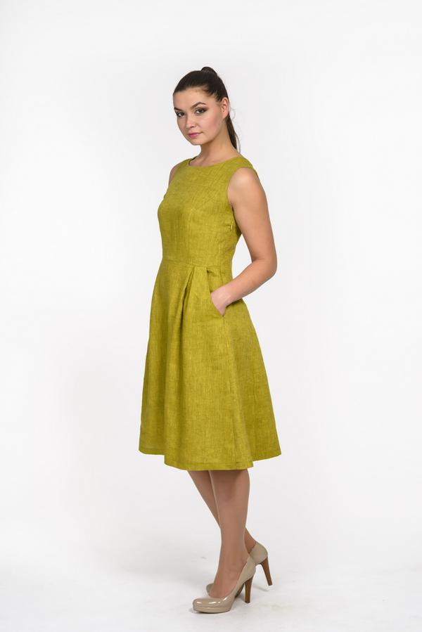 Платье женское полуприлегающего силуэта, расширенного к низу от линии талии. Вырез горловины расширенный скругленной формы. По переду отрезная линия талии, рельефы, карманы в отсечном бочке. По спинке средний шов и рельефы. Застёжка на потайную молнию в боковом шве