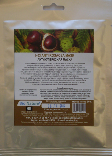 Маска для чувствительной кожи с симптомами розацеа, склонной к покраснению раздражению. Уменьшает эритему, обладает антибактериальным и противовоспалительным действием. Укрепляет кровеносные сосуды, уменьшает проницаемость и ломкость капилляров.