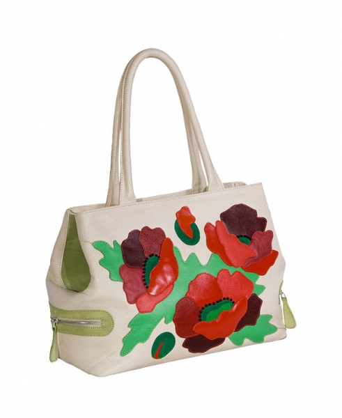 Сумка женская, натуральная кожа и (или) натуральная замша. На передней стенке аппликация из разноцветной кожи. Внутри три независимых отделения. Вмещается формат А4. Закрывается на молнии. Размер: 45х18х30 (см), ручки - 24 (см)