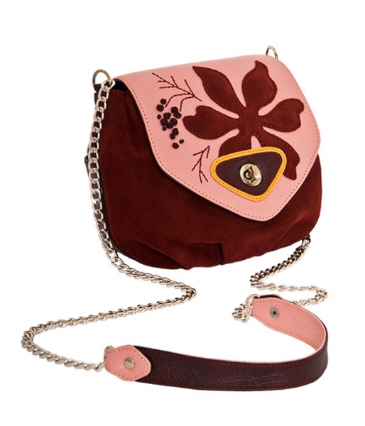 Сумка женская, натуральная кожа и (или) замша. На передней стенке аппликация из разноцветной кожи с вышивкой. Закрывается на поворотную застежку. Сзади карман на кнопке, внутри два отделения и карман-средник на молнии. Размер: 20х6,5х19 (см), ручка - 67 (см)