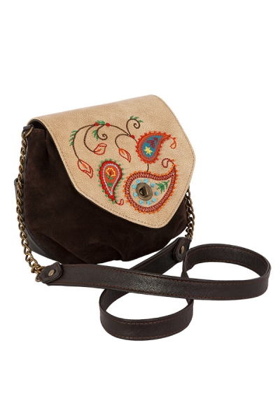 Сумка женская, натуральная кожа и (или) замша. На передней стенке аппликация из разноцветной кожи с вышивкой. Закрывается на поворотную застежку. Сзади карман на кнопке, внутри два отделения и карман-средник на молнии. Размер: 20х6,5х19 (см), ручка - 67 (см)