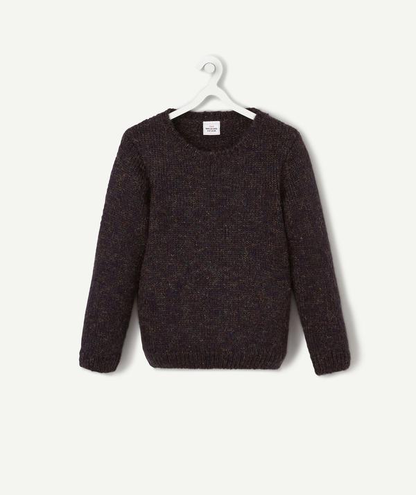 Knitted jumper with a round neck. In a fine dark knit, enhanced by coloured details. The knit is gathered in at the waist, the sleeves and neck.