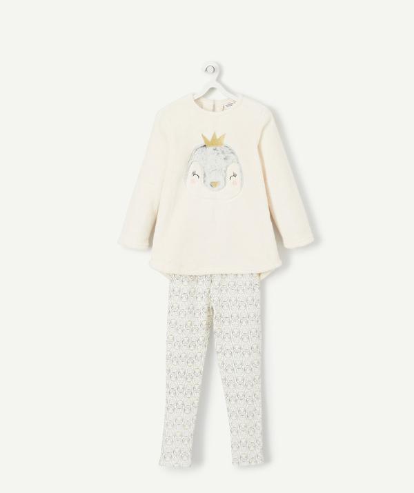 Pyjama 2 pièces, bimatière, bien chaud. T-shirt mi-long, manches longues, col rond, en fausse fourrure blanche. Animation en relief sur l'avant. Legging à motif. https://www.t-a-o.com/en/mode-fille/pyjama/le-pyjama-de-noel-en-velours-blanc-snow-white-90060.html