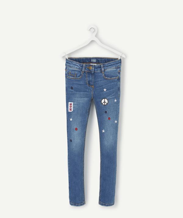 Skinny jeans with a faded effect. Coloured patches on the front and embroidered stars as well. Five pockets, they fasten with a hook and zip. Adjustable waist.