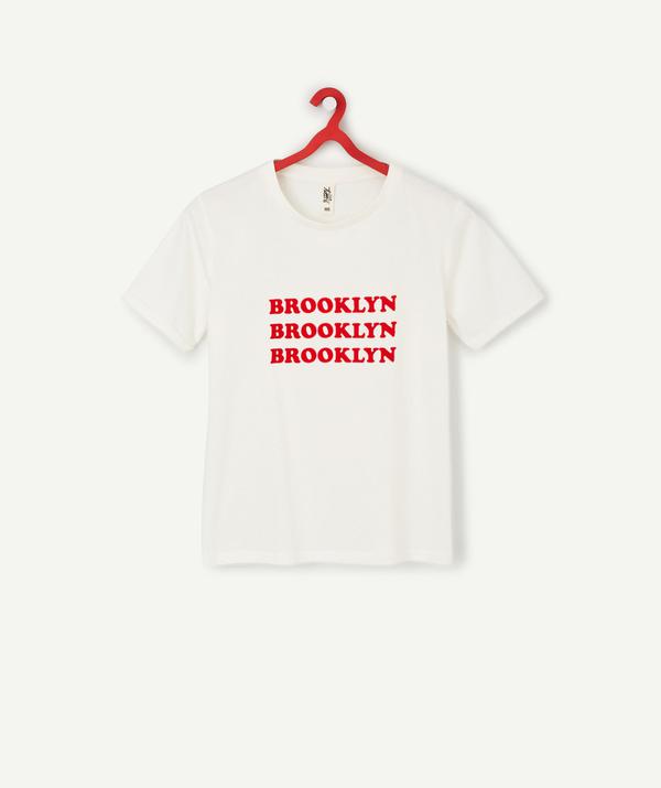 Cotton t-shirt, short sleeves and a round neck. Comfortable material and a repeated red "Brooklyn" print on the front.