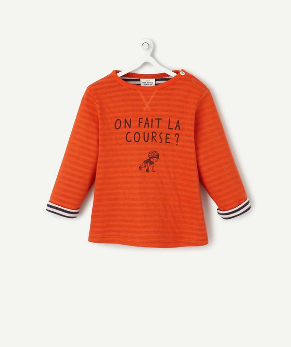 T-shirt with long sleeves and a round neck in cotton, lined to keep you nice and warm. Striped interior and coloured exterior. Message and design printed on the front. The cuffs on the sleeves can be rolled down. The product plus: the press-studs on the shoulder which make it easy to put on. https://www.t-a-o.com/en/fashion-baby-boy/t-shirt/printed-lined-t-shirt-mandarin-red-90232.html