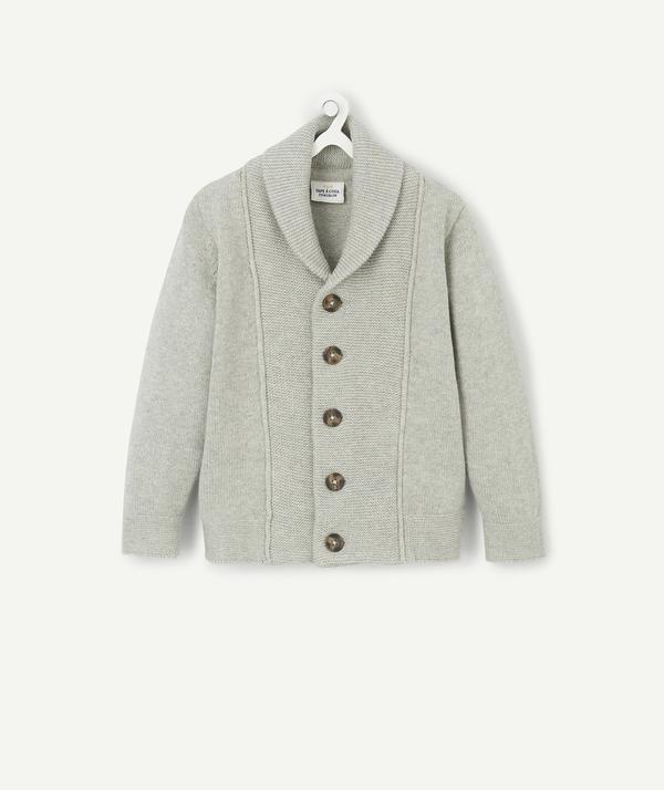 Lovely warm chunky knit jacket. Knitted in different kinds of stitches. Wide shawl collar and button fastening. Cotton 100% https://www.t-a-o.com/en/fashion-baby-boy/cardigan/grey-knitted-jacket-bros-b10-89013.html