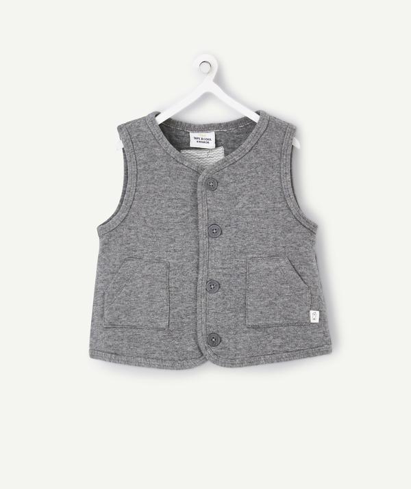 Grey sleeveless jacket. Two small pockets and button fastening all the way down the front. Polyester 100% https://www.t-a-o.com/en/collection-newborn/newborn-girl/pullovers-cardigans/sleeveless-cotton-waistcoat--beige-89016.html