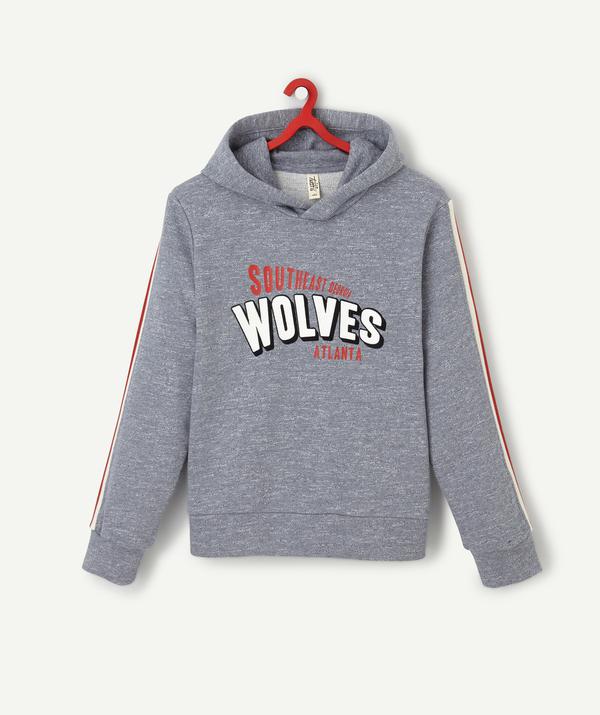 Hooded sweatshirt in a cotton blend. Nice warm lining. Ribbing at the wrists, at the waist and at the neck. Coloured message printed on the front and decorative bands the way down the sleeves.