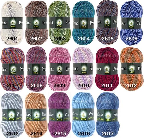 Лидер продаж - артикул Brilliant с фантазийным типом крашения. Производители рекомендуют спицы №2.5 - 3, крючок 2.5. На вязаном образце 10х10см получается 37 рядов по 27 петель.