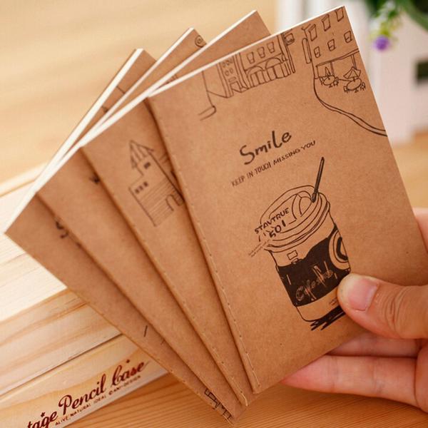 Блокнот в стиле ретро "Хобби" с прошитой обложкой из коричневой крафт-бумаги с авторскими рисунками. Все внутренние листы разлинованы в обычную школьную линейку, что очень удобно. Блокнот тонкий, всего на 20 листов, с размерами 12 см на 8.5 см.